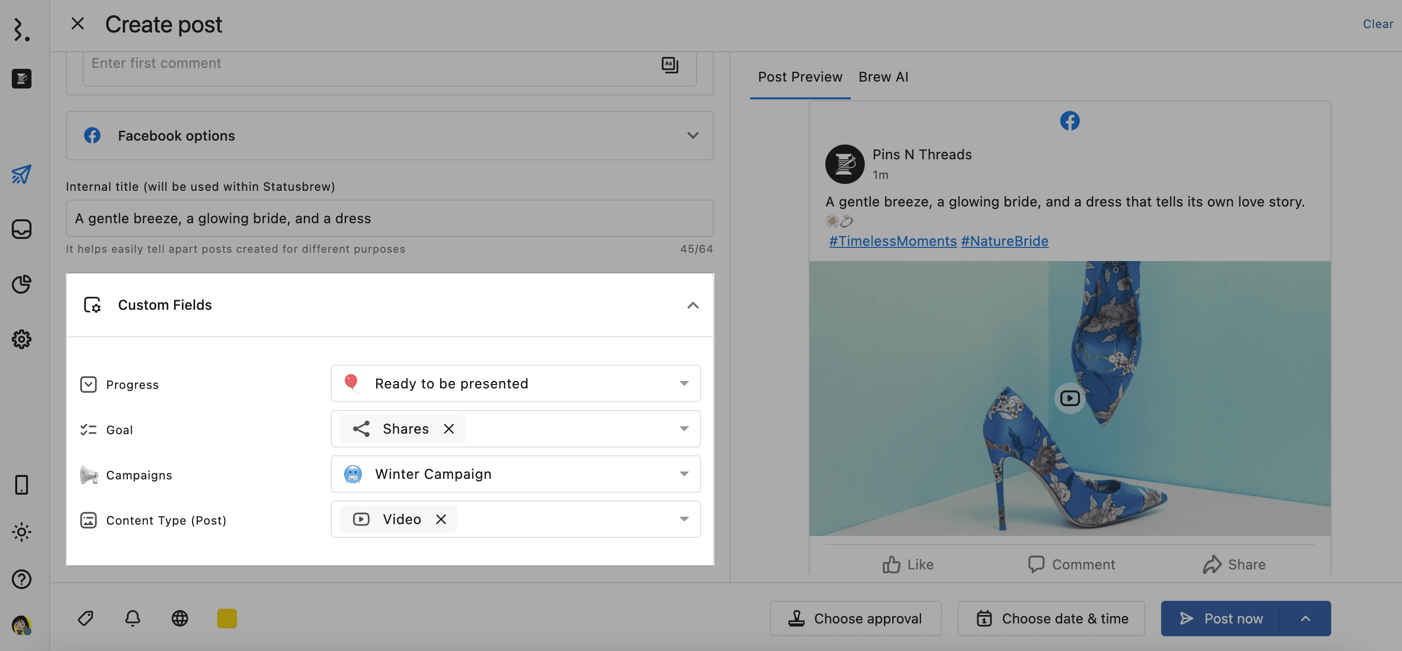 Expand the Custom Fields section to add structured labels that help your team track specific post details consistently, such as post status, campaign type, or priority.