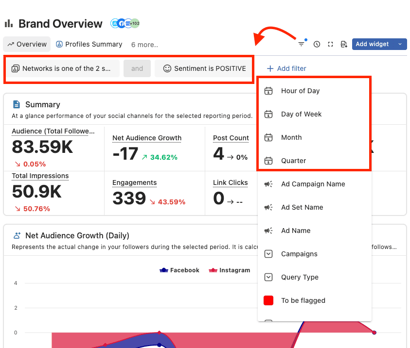 Once you set the filters, the content displayed in each widget will automatically update based on them.
