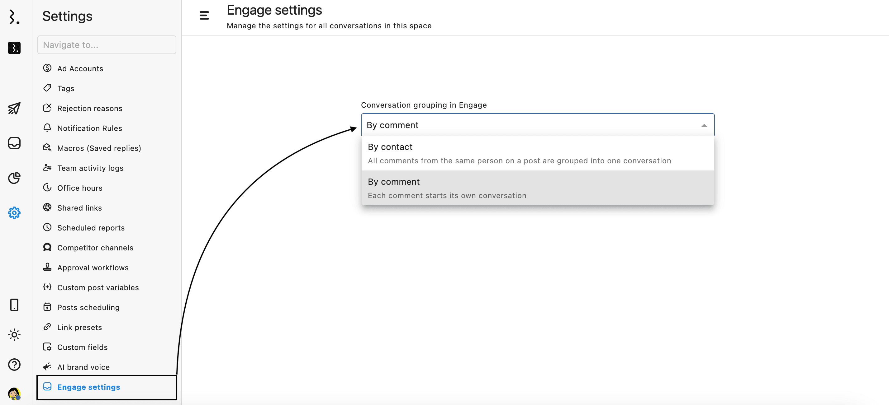 Statusbrew gives you control over how comments on a post by the same person are grouped in your Engage inbox.