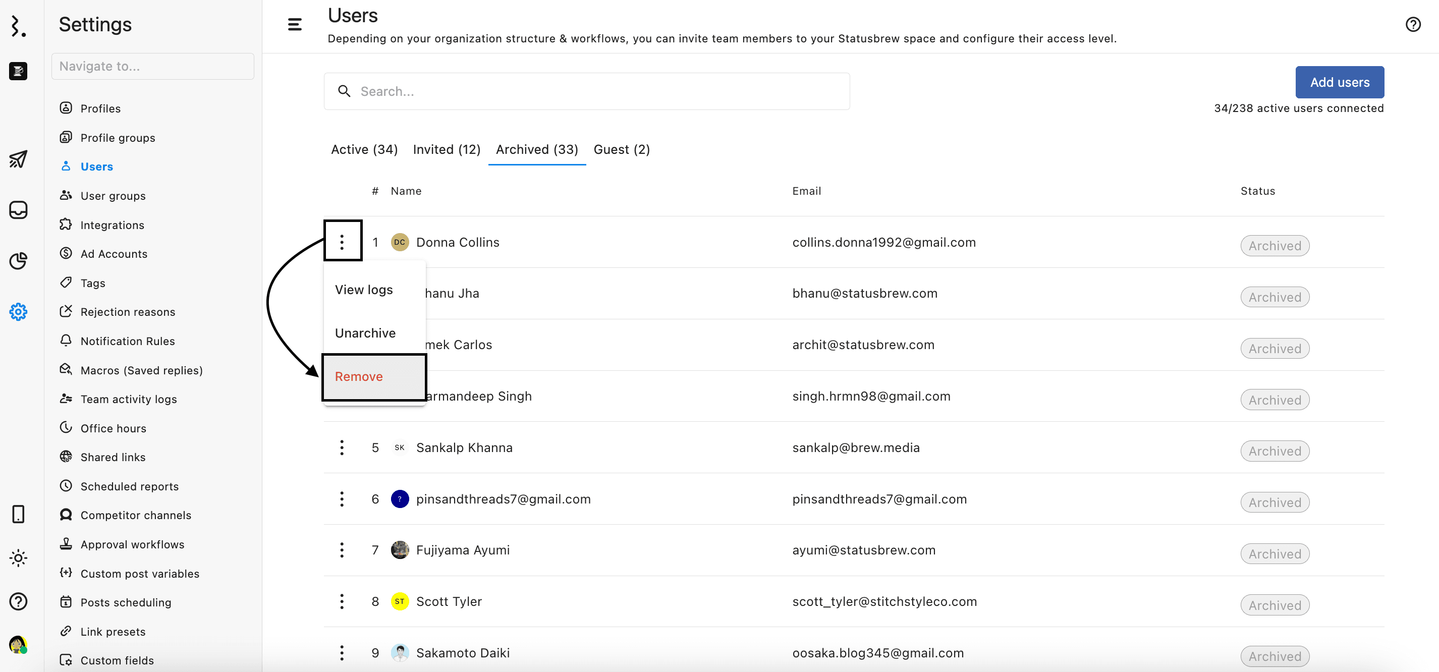 This way, you can now remove outdated or inactive users from your Statusbrew space that are no longer needed and keep your user list clean and easier to manage.