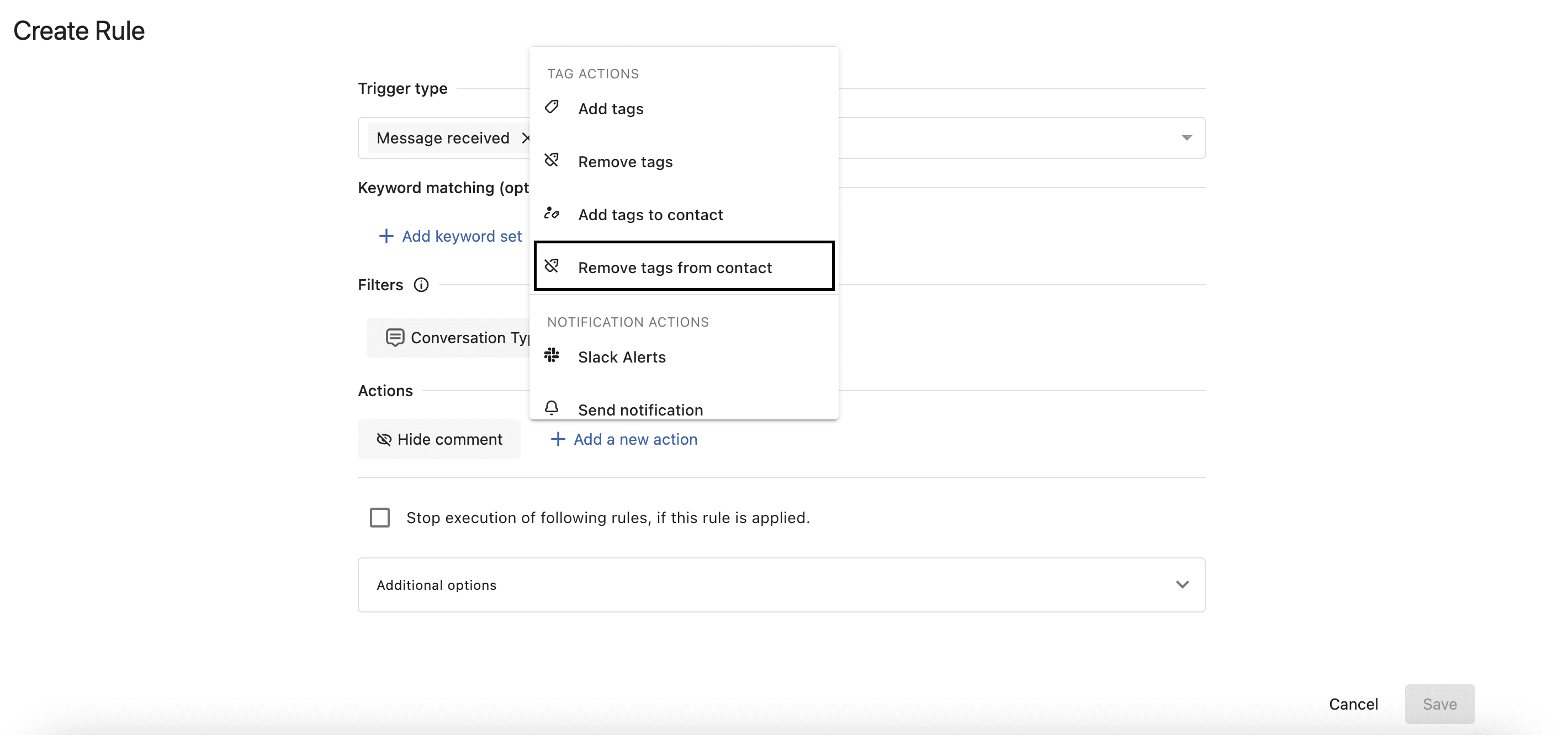 You can now add a new action of Remove tags from contact when setting up rules in the Rule Engine.