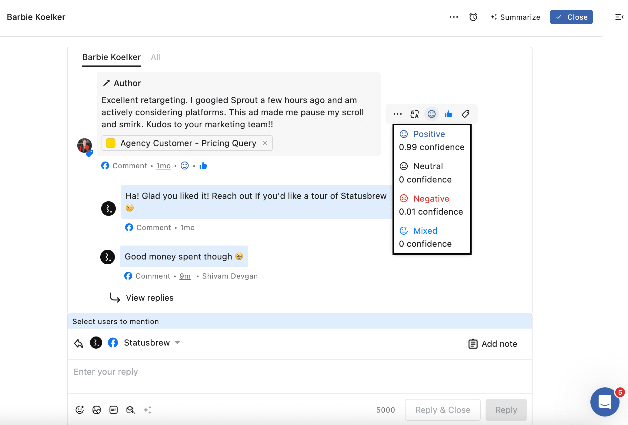 Sentiment analysis in Statusbrew can help you understand customer emotions, prioritize your incoming messages and reduce noise in the Engage Inbox, track brand health, and identify potential crises.