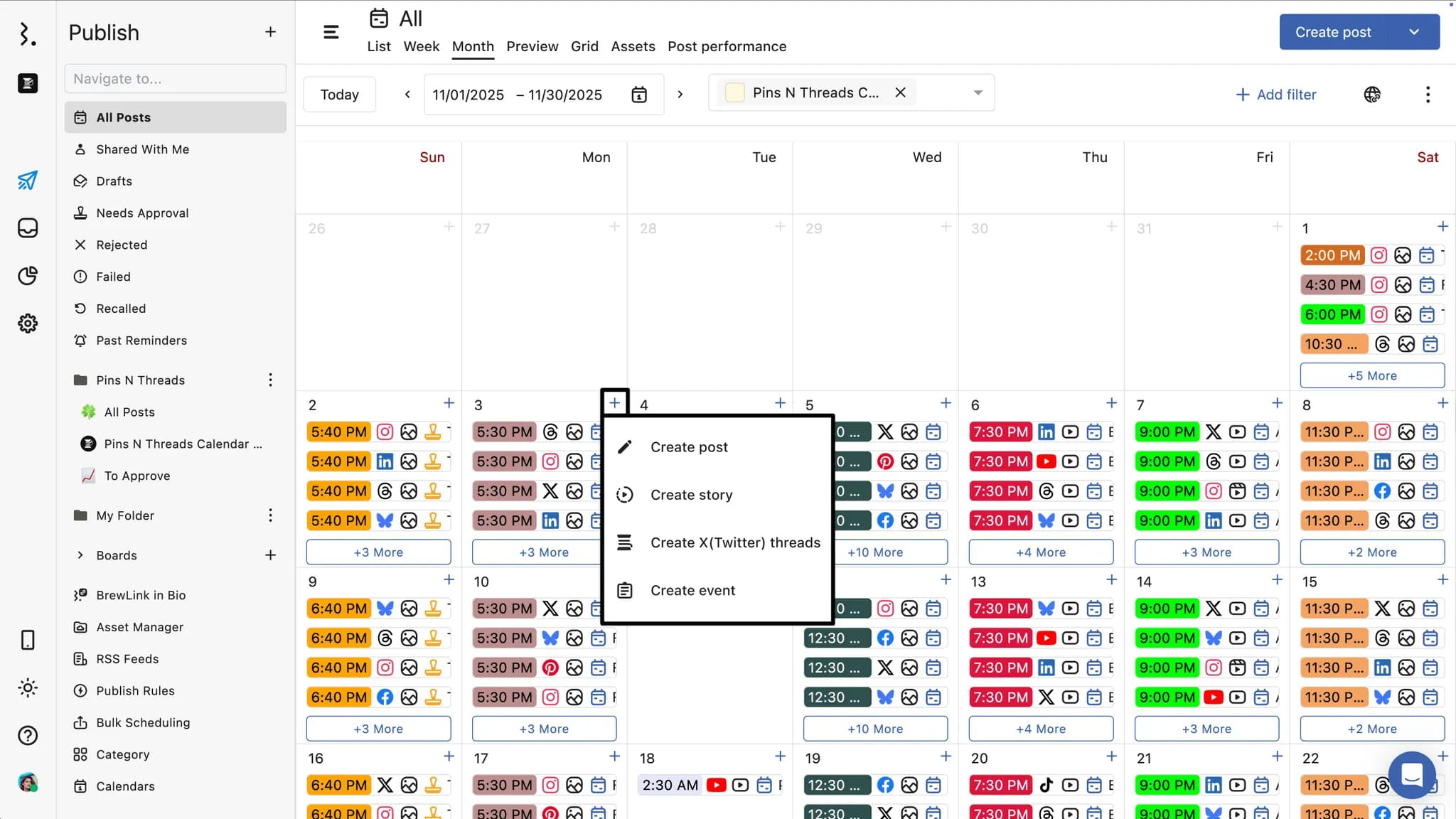 A Calendar gives you a structured view of all posts, drafts, and Events in one place. You can also set up additional calendars to separately plan and manage content for different brands, clients, or campaigns.