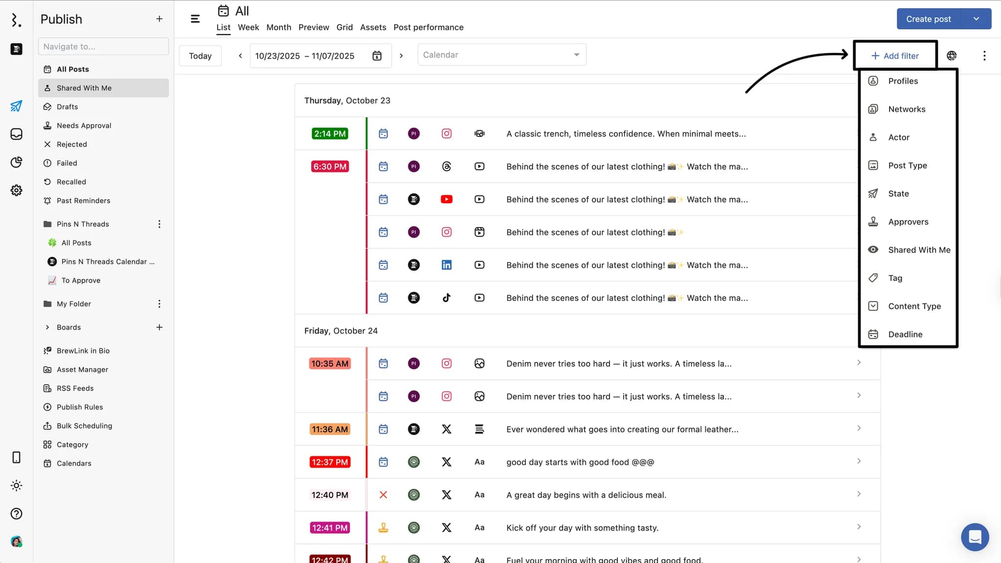 Applying filters in the Planner helps you quickly zero in on the posts that matter most. Instead of scrolling through every piece of content, you can apply filters to focus on specific posts.