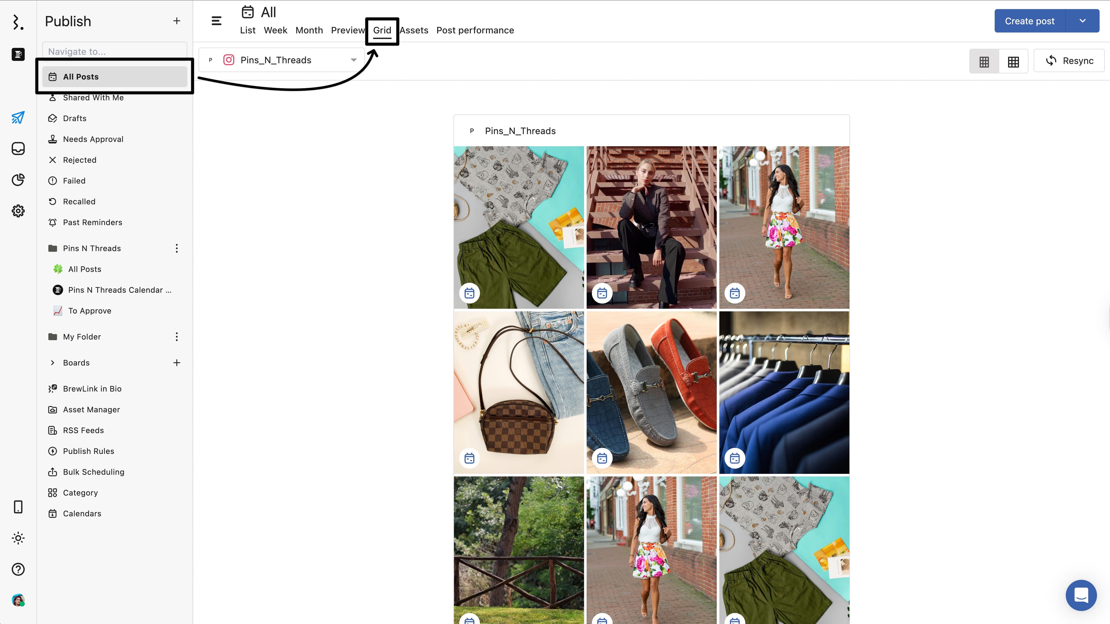 Grid View (Instagram only): Displays your Instagram posts in a grid layout, replicates how your feed will look.