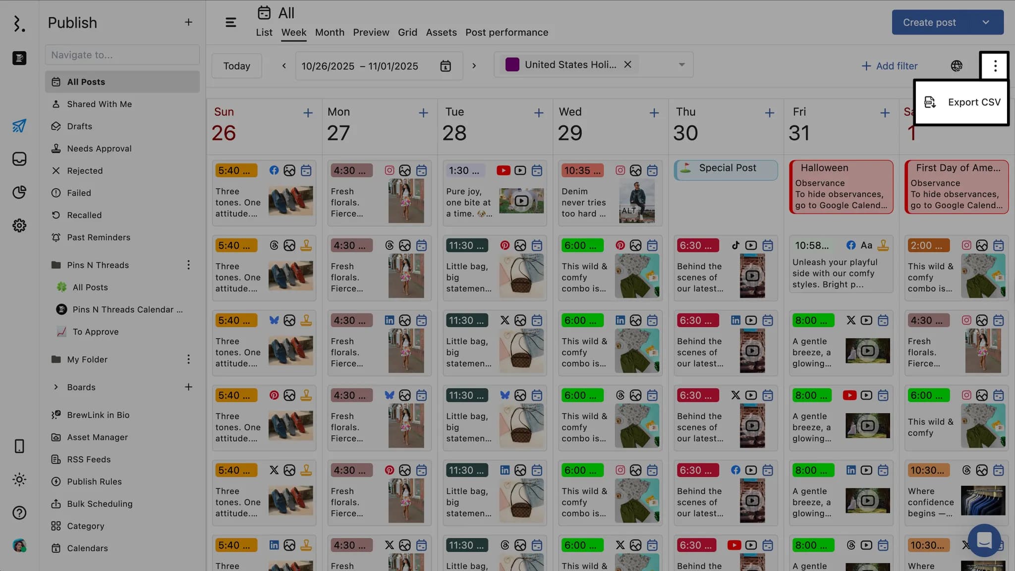 Export posts as a CSV file for sharing your content with others or keeping an offline backup of your content calendar. Only the displayed (filtered) posts is exported, according to the currently selected filters, calendar, and date range.