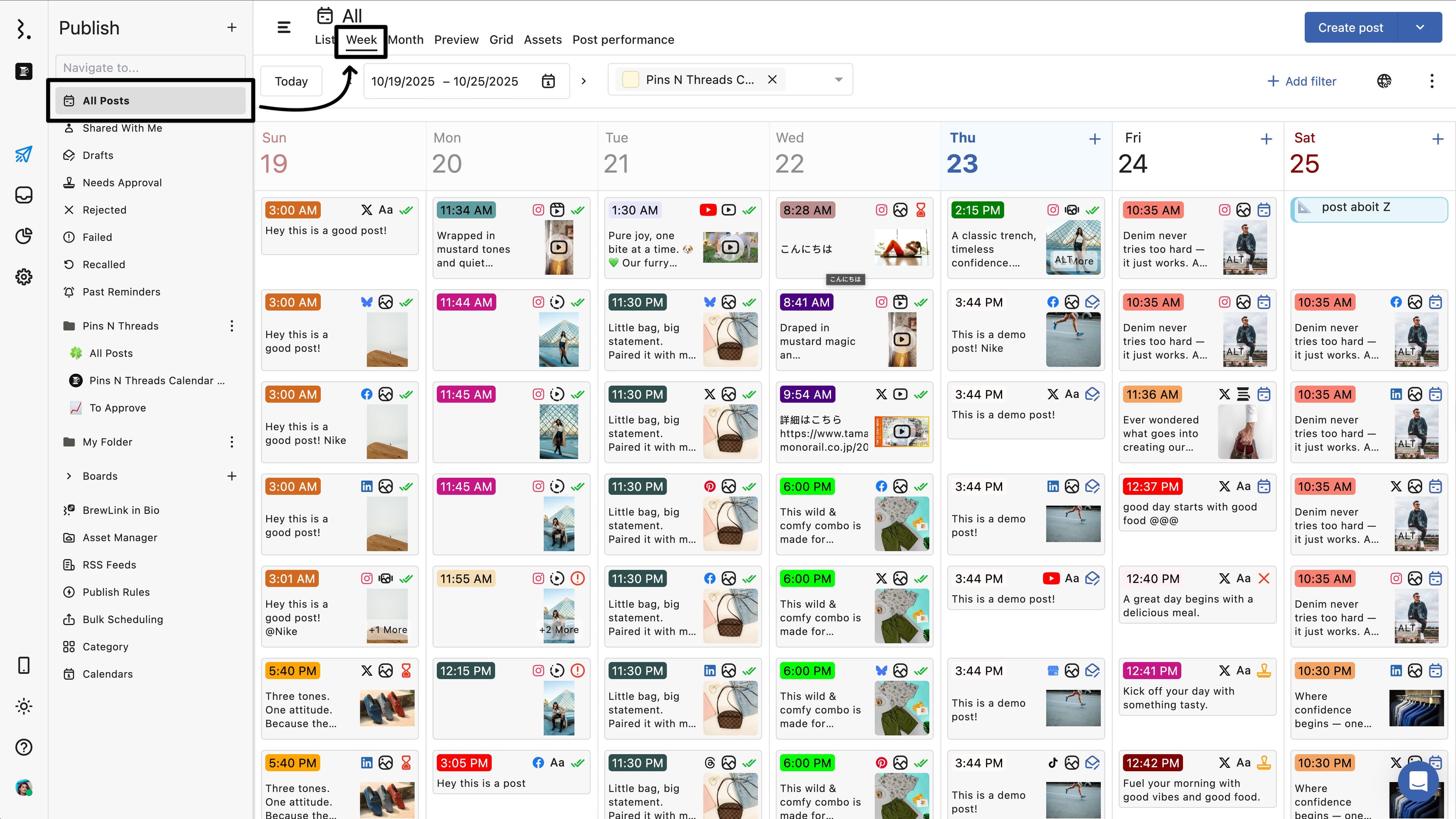 Week View: Displays all posts and events for a given week in a calendar layout.