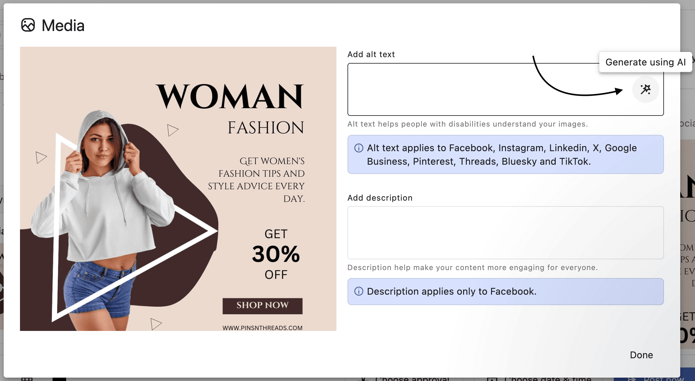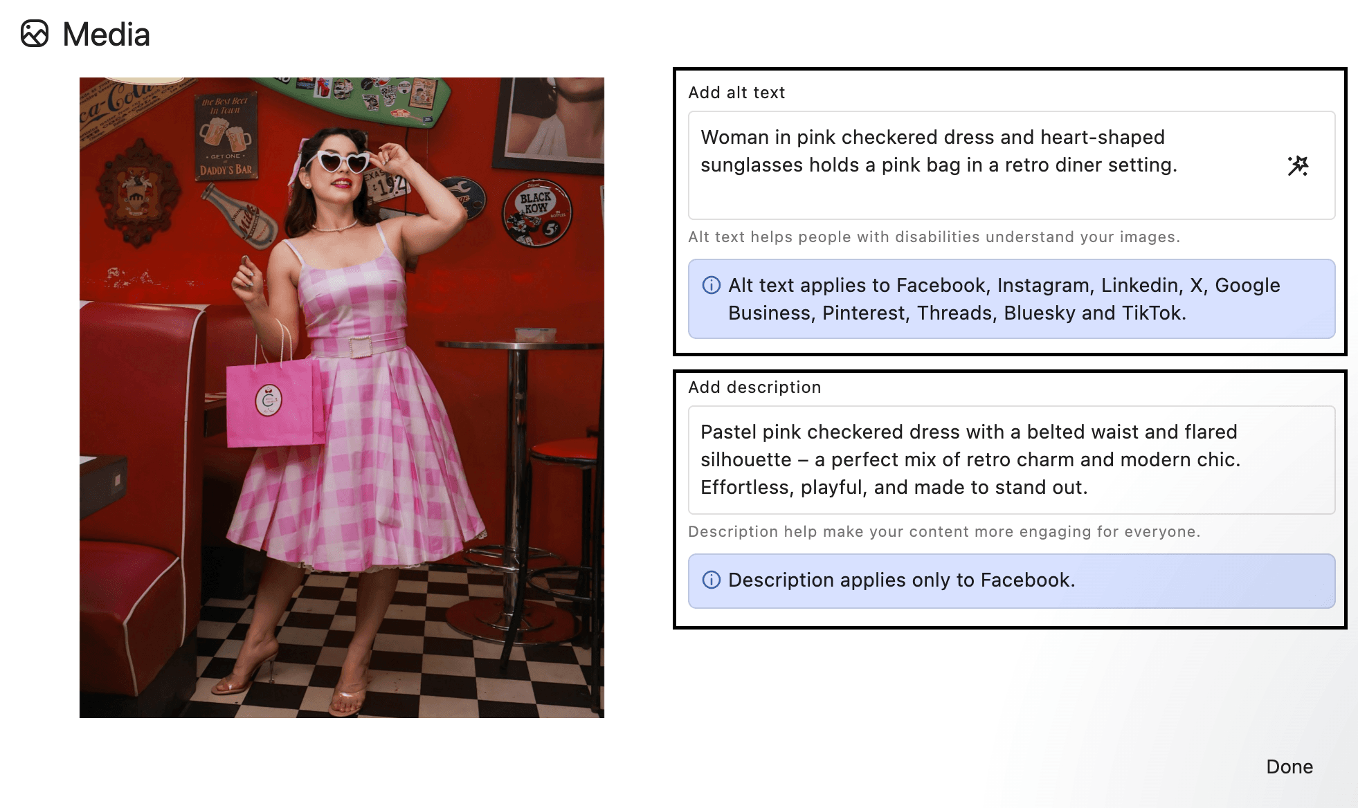 Edit options: Opens the media editor, where you can Add alt text (for Facebook, Instagram, LinkedIn, X, Google Business, Pinterest, Threads, Bluesky and TikTok) and Add description (Facebook). You can also generate alt text using AI.