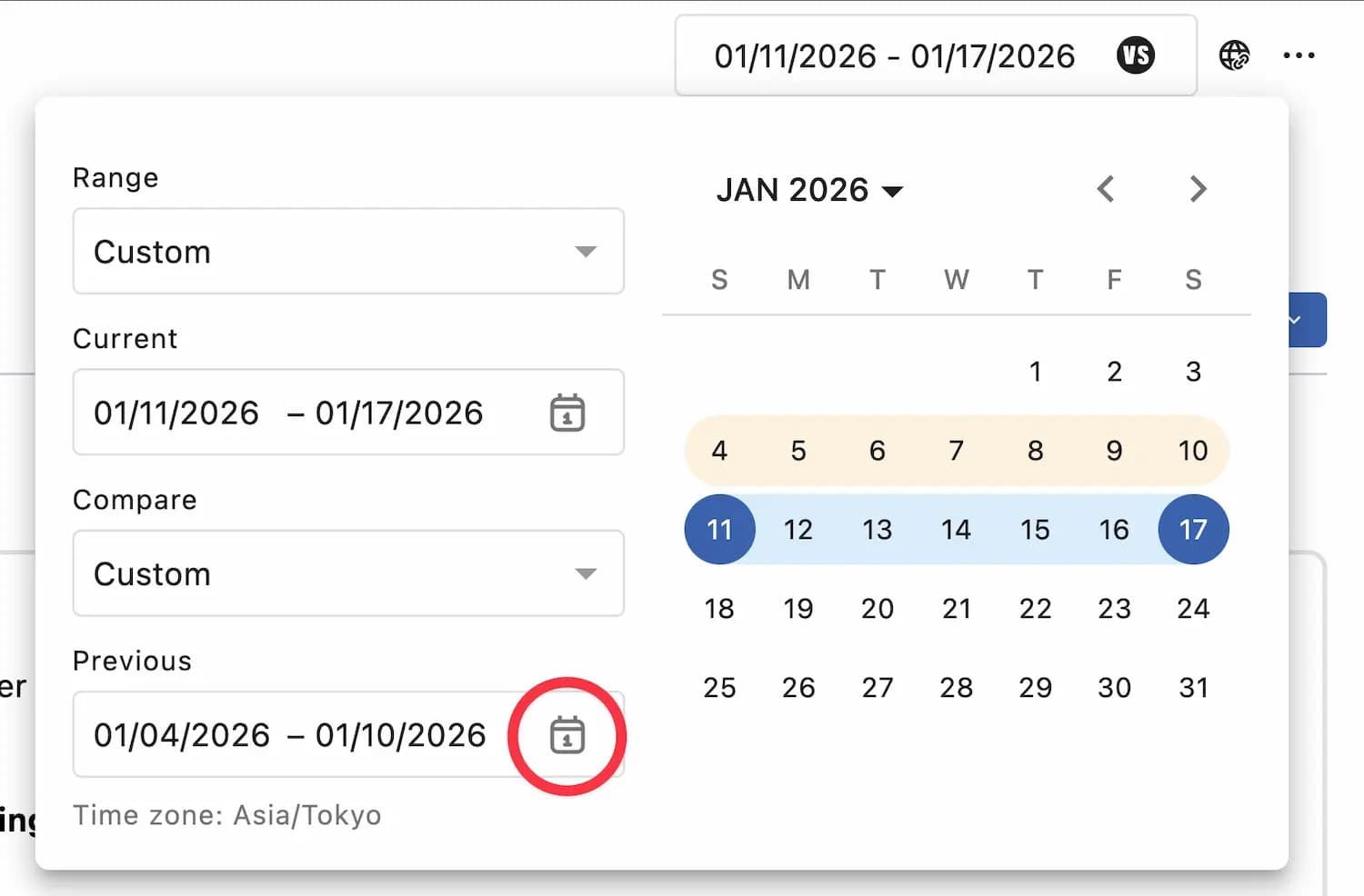If you select Custom , you can set your preferred comparison period. The Previous Range section will appear, so click the calendar icon. A calendar will then appear where you can select the comparison period, so please select the period you prefer.