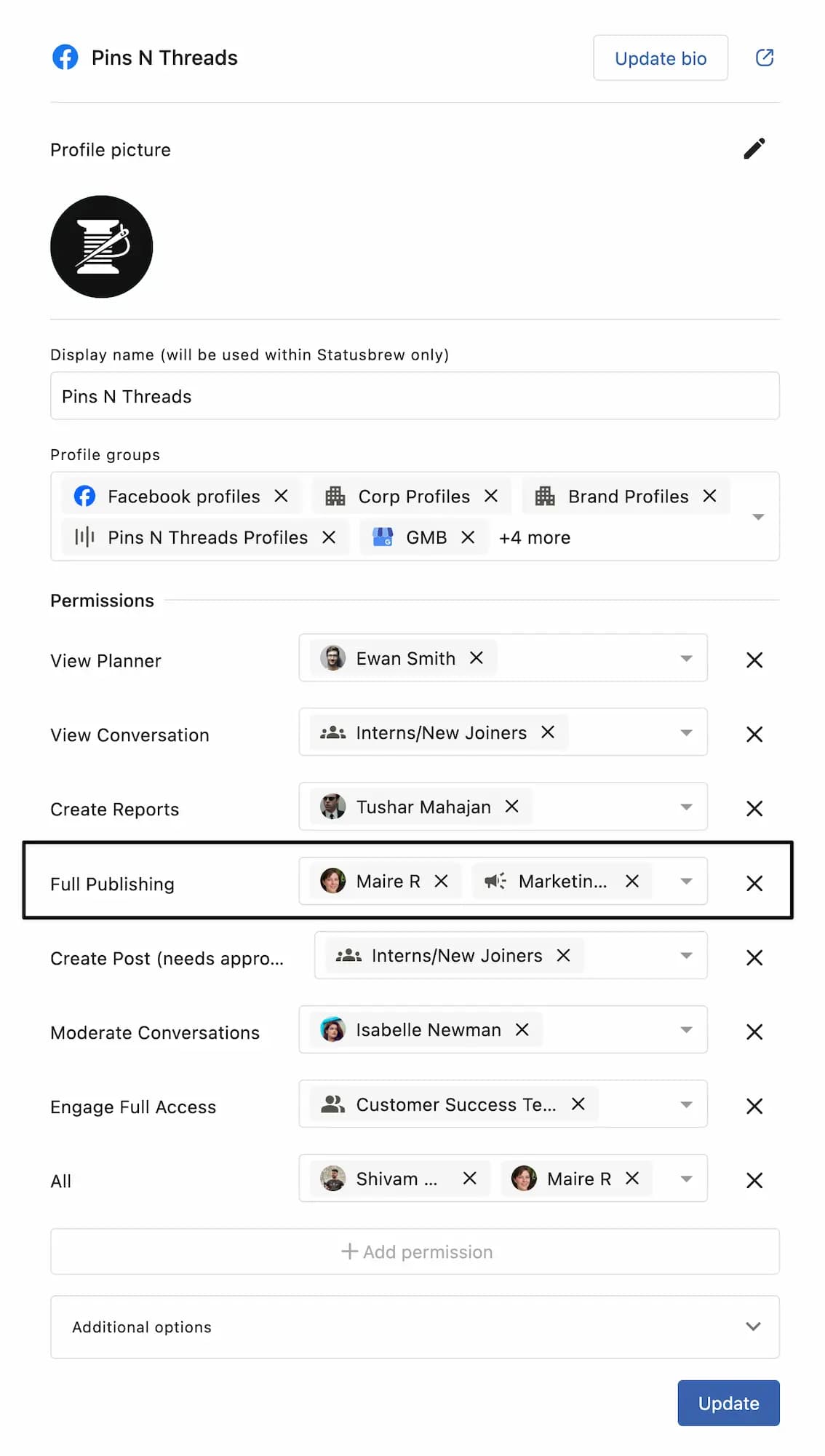 For example, if you give a team member Full Publishing permission, they will be able to post on your company's social profile, but they won't be able to respond to comments on those posts from Statusbrew.