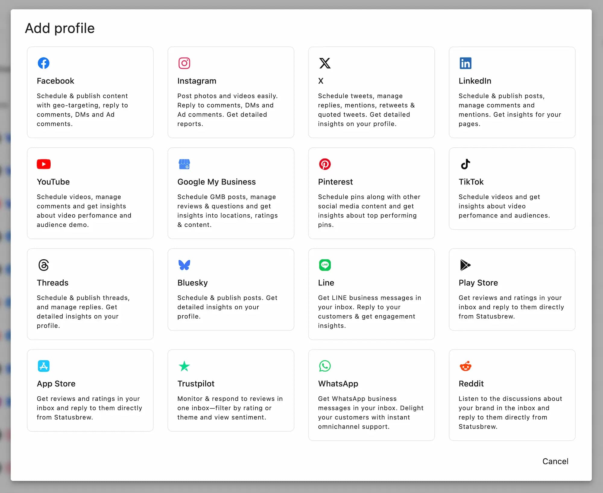 You don’t create social profiles in Statusbrew — you connect profiles that already exist on social platforms you own or administer.