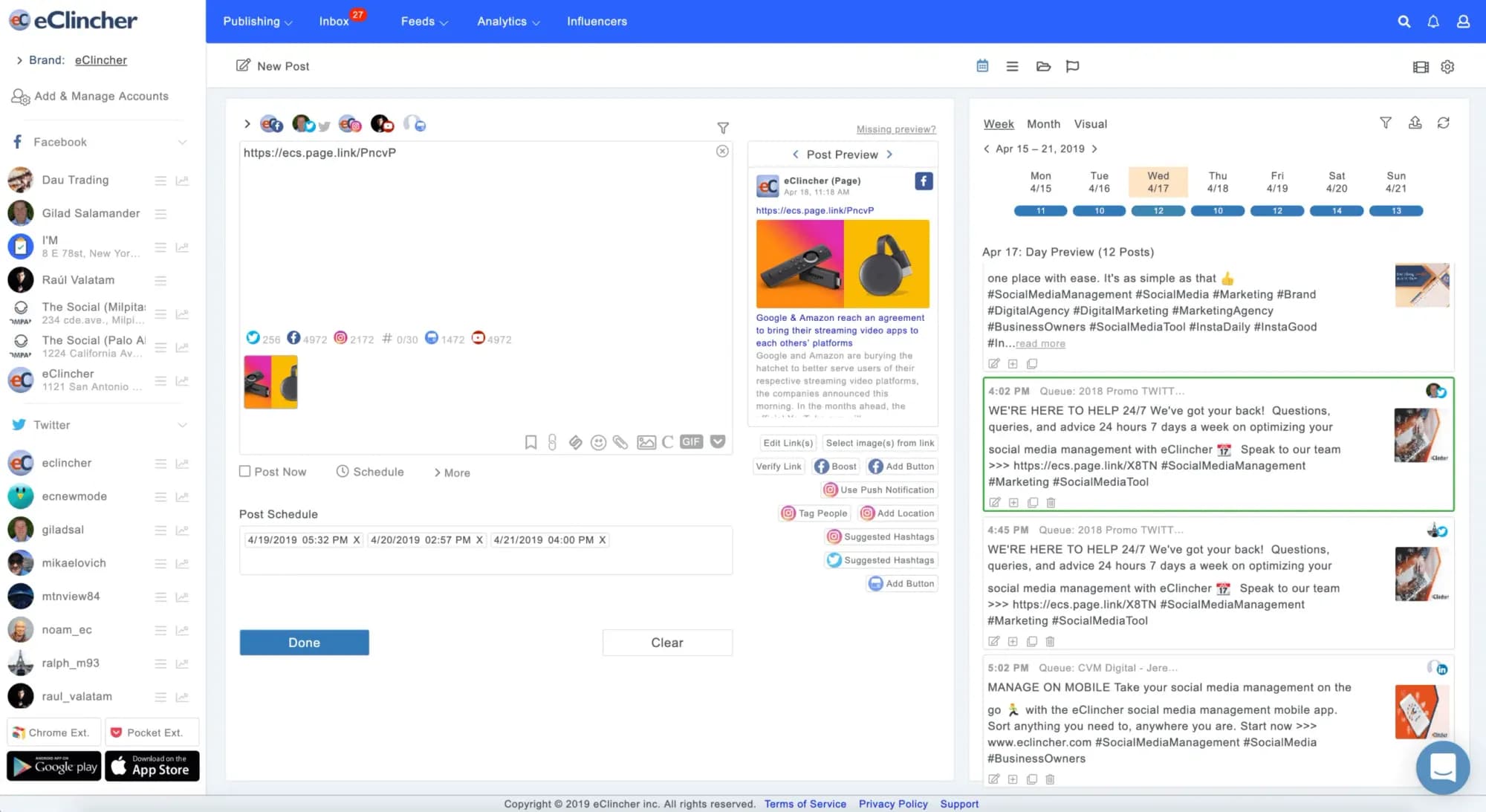 eClincher is also quite affordable as its lowest-tier plan for individuals and micro-businesses starts at $65 per month. eClincher's customer service is quick, supportive, and extremely helpful.