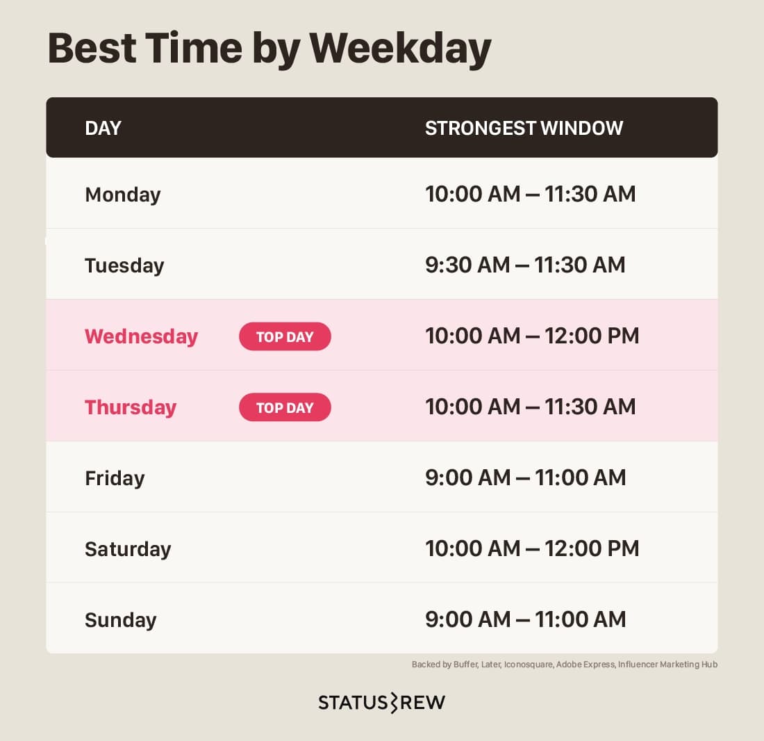 Instead of relying on one study, we mapped the recommended posting windows across multiple independent 2025–2026 analyses, including: