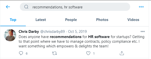 Type "recommendations" in the search bar followed by keywords related to your business. For example, "recommendations, hr software," and here's a question from a user looking for a similar tool!