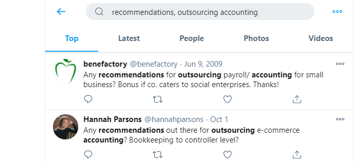 Here’s another example. We searched for “recommendations, outsourcing accounting”. And below are questions from 2 users.